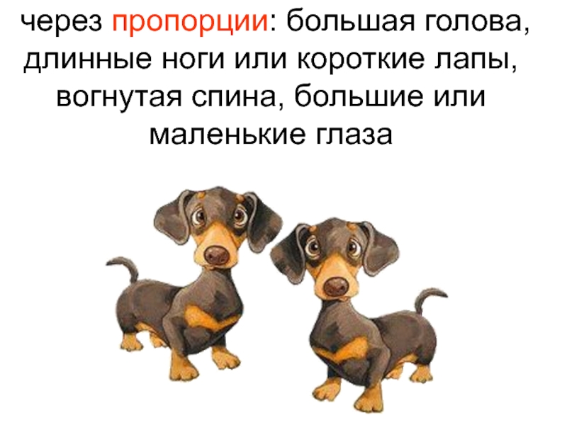 Слайд 7 через пропорции: большая голова, длинные ноги или короткие лапы,