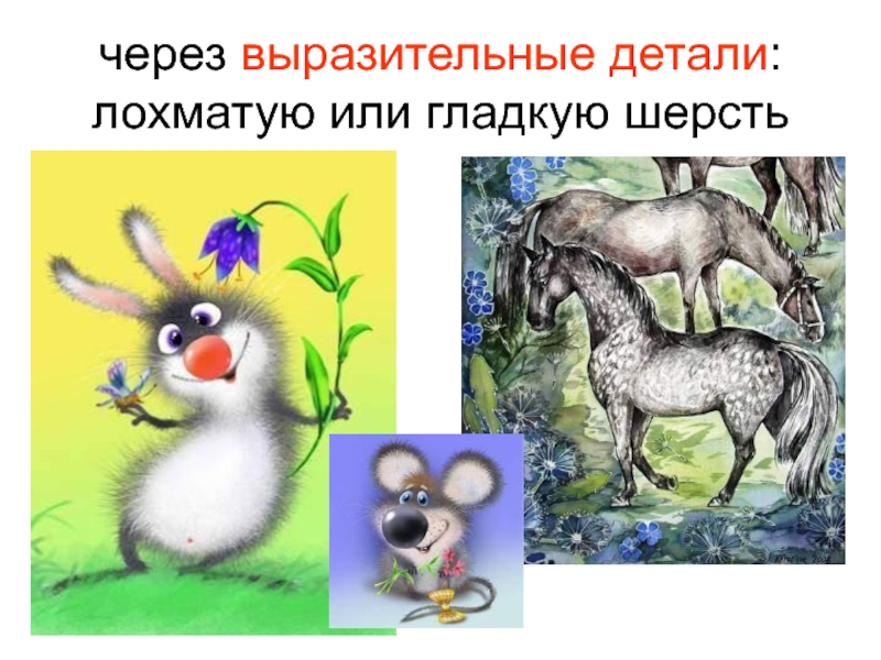 Слайд 8через выразительные детали: лохматую или гладкую шерсть
