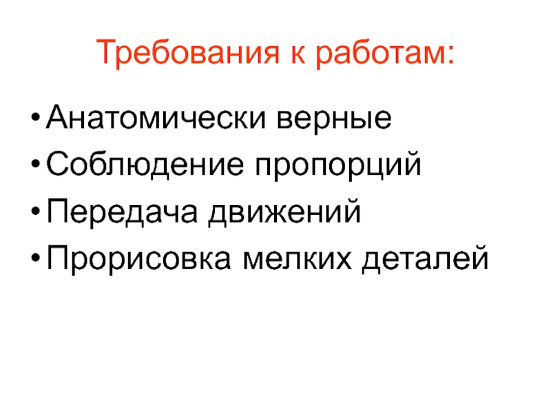 Требования к работам:Анатомически верныеСоблюдение пропорцийПередача движенийПрорисовка мелких деталей