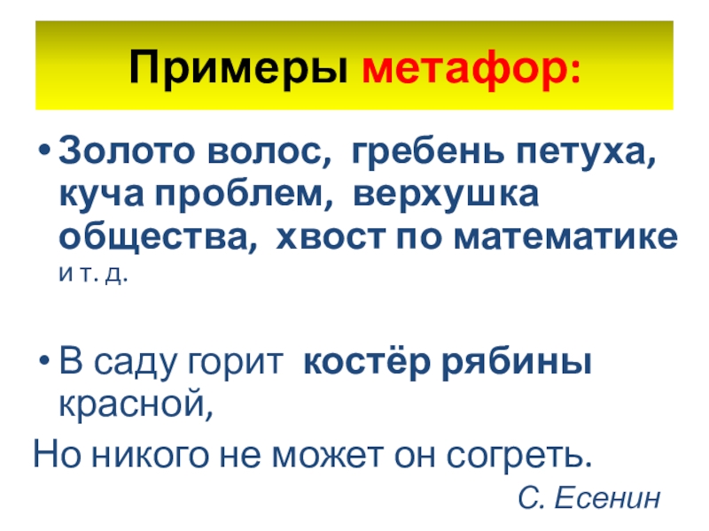Примеры метафор:Золото волос, гребень петуха, куча проблем, верхушка общества, хвост по математике и т. д.В саду горит