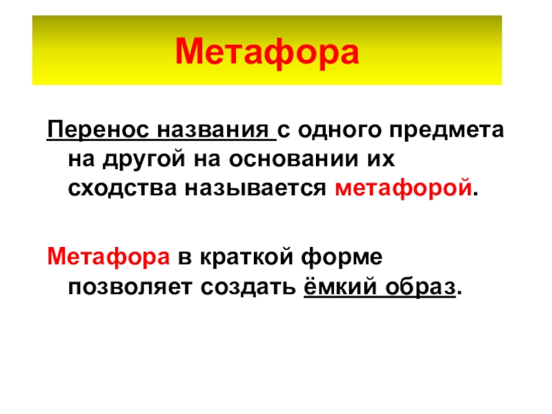МетафораПеренос названия с одного предмета на другой на основании их сходства называется метафорой.Метафора в краткой форме позволяет