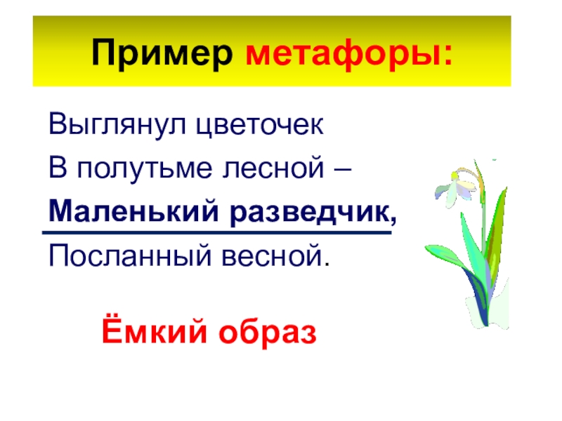 Пример метафоры:Выглянул цветочекВ полутьме лесной –Маленький разведчик, Посланный весной.Ёмкий образ