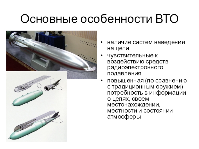 Основные особенности ВТО наличие систем наведения на целичувствительные к воздействию средств радиоэлектронного подавленияповышенная (по сравнению с традиционным