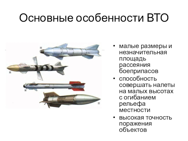 Основные особенности ВТО малые размеры и незначительная площадь рассеяния боеприпасовспособность совершать налеты на малых высотах с огибанием