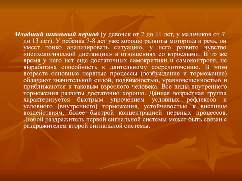лет уже хорошо развиты моторика и речь, он умеет тонко анализировать ситуацию, у него развито чувство «психологической дистанции» в отношениях со взрослыми. В то же время у него нет еще достаточных самокритики и самоконтроля, не выработана способность к длительному сосредоточению. В этом возрасте основные нервные процессы (возбуждение и торможение) обладают значительной силой, подвижностью, уравновешенностью и приближаются к таковым взрослого человека. Все виды внутреннего торможения развиты достаточно хорошо. Данная возрастная группа характеризуется быстрым упрочением условных рефлексов и условного (внутреннего) торможения, устойчивостью к внешним воздействиям, более быстрой концентрацией нервных процессов. Любой раздражитель первой сигнальной системы может быть связан с раздражителем второй сигнальной системы.