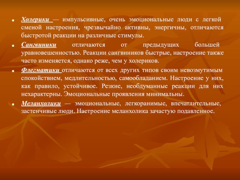 Слайд 20Холерики — импульсивные, очень эмоциональные люди с легкой сменой настроения,