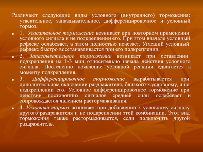 Слайд 16Различают следующие виды условного (внутреннего) торможения: угасательное, запаздывательное, дифференцировочное и