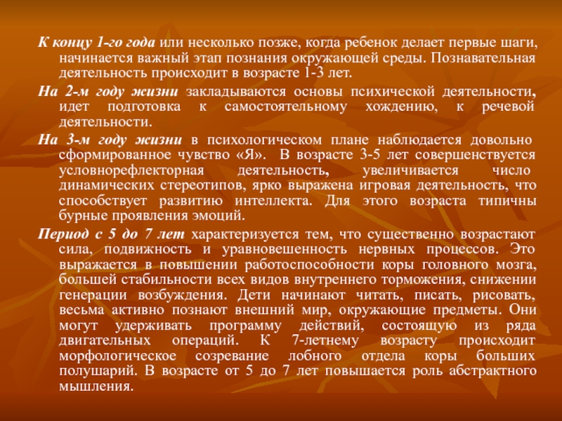 Период с 5 до 7 лет характеризуется тем, что существенно возрастают сила, подвижность и уравновешенность нервных процессов. Это выражается в повышении работоспособности коры головного мозга, большей стабильности всех видов внутреннего торможения, снижении генерации возбуждения. Дети начинают читать, писать, рисовать, весьма активно познают внешний мир, окружающие предметы. Они могут удерживать программу действий, состоящую из ряда двигательных операций. К 7-летнему возрасту происходит морфологическое созревание лобного отдела коры больших полушарий. В возрасте от 5 до 7 лет повышается роль абстрактного мышления.