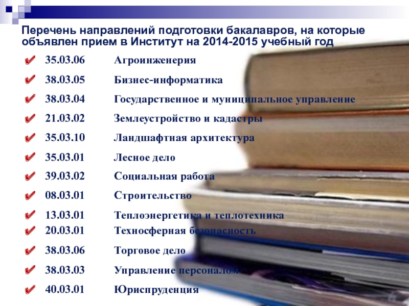 Перечень направлений подготовки бакалавров, на которые объявлен прием в Институт