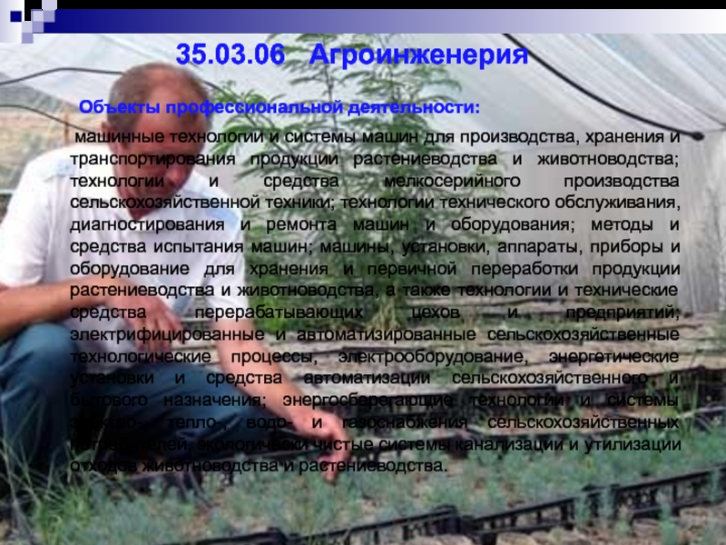 животноводства; технологии и средства мелкосерийного производства сельскохозяйственной техники; технологии технического обслуживания, диагностирования и ремонта машин и оборудования; методы и средства испытания машин; машины, установки, аппараты, приборы и оборудование для хранения и первичной переработки продукции растениеводства и животноводства, а также технологии и технические средства перерабатывающих цехов и предприятий; электрифицированные и автоматизированные сельскохозяйственные технологические процессы, электрооборудование, энергетические установки и средства автоматизации сельскохозяйственного и бытового назначения; энергосберегающие технологии и системы электро-, тепло-, водо- и газоснабжения сельскохозяйственных потребителей, экологически чистые системы канализации и утилизации отходов животноводства и растениеводства.