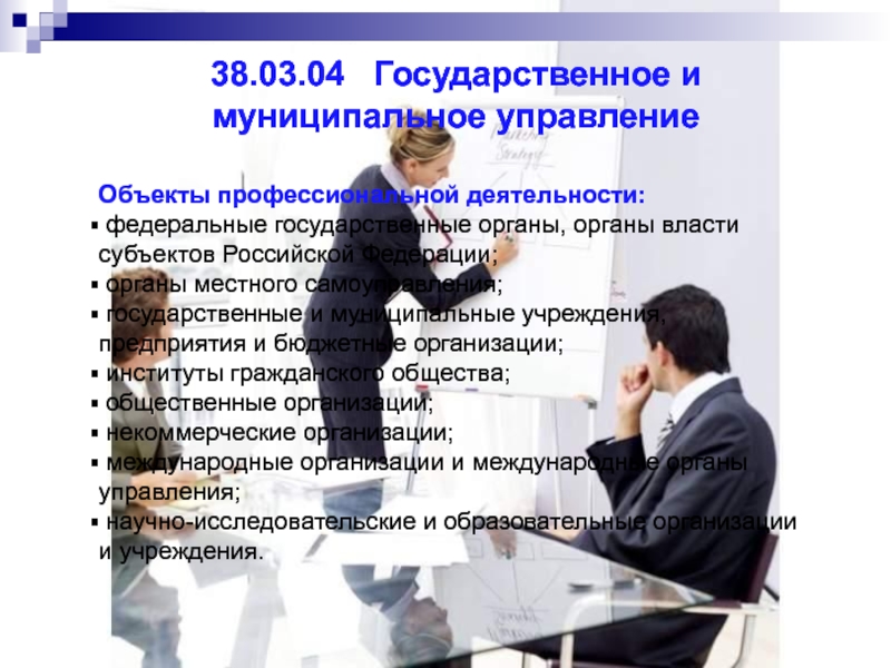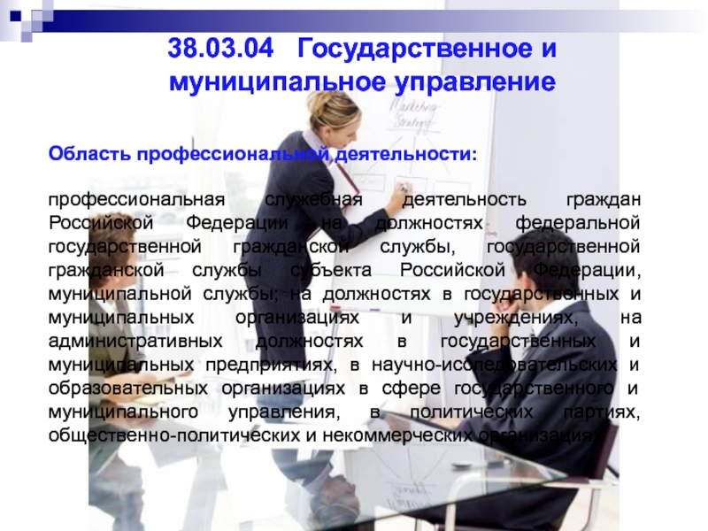 Федерации, муниципальной службы; на должностях в государственных и муниципальных организациях и учреждениях, на административных должностях в государственных и муниципальных предприятиях, в научно-исследовательских и образовательных организациях в сфере государственного и муниципального управления, в политических партиях, общественно-политических и некоммерческих организациях
