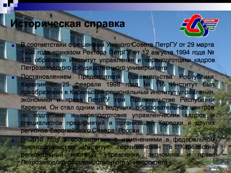 года № 173 образован Институт управления и переподготовки кадров Петрозаводского государственного университета