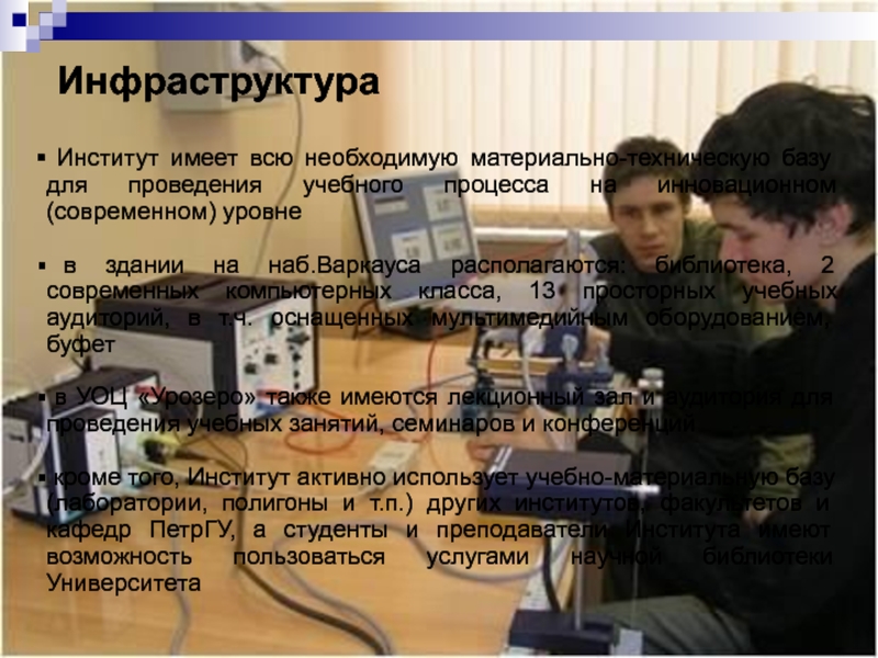 кроме того, Институт активно использует учебно-материальную базу (лаборатории, полигоны и т.п.) других институтов, факультетов и кафедр ПетрГУ, а студенты и преподаватели Института имеют возможность пользоваться услугами научной библиотеки Университета