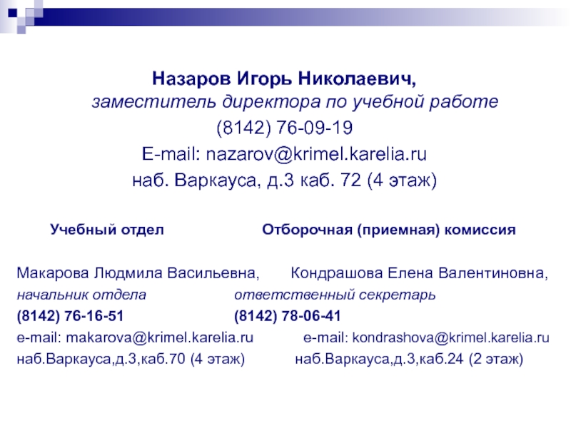 наб.Варкауса,д.3,каб.70 (4 этаж)      наб.Варкауса,д.3,каб.24 (2 этаж)