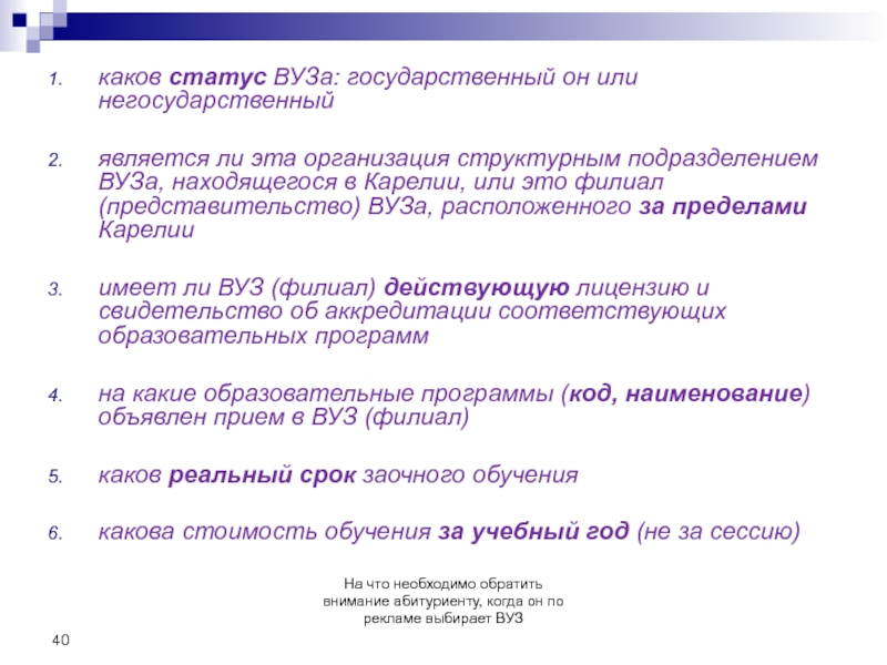 Слайд 40каков статус ВУЗа: государственный он или негосударственный
