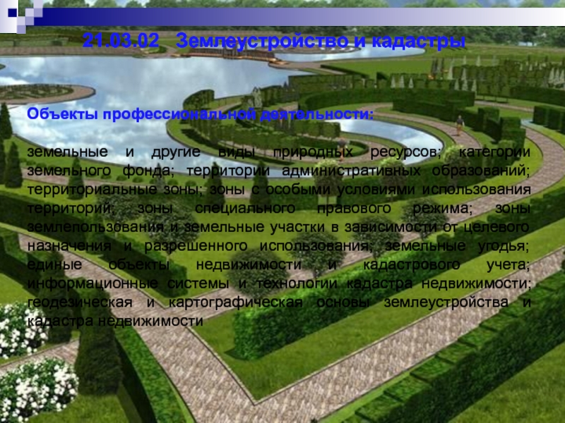 зоны с особыми условиями использования территорий; зоны специального правового режима; зоны землепользования и земельные участки в зависимости от целевого назначения и разрешенного использования; земельные угодья; единые объекты недвижимости и кадастрового учета; информационные системы и технологии кадастра недвижимости; геодезическая и картографическая основы землеустройства и кадастра недвижимости
