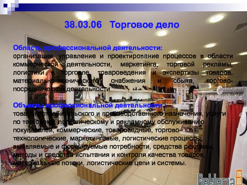 торговле, товароведения и экспертизы товаров, материально-технического снабжения и сбыта, торгово-посреднической деятельности