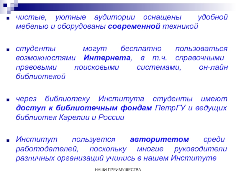 через библиотеку Института студенты имеют доступ к библиотечным фондам ПетрГУ и ведущих библиотек Карелии и России