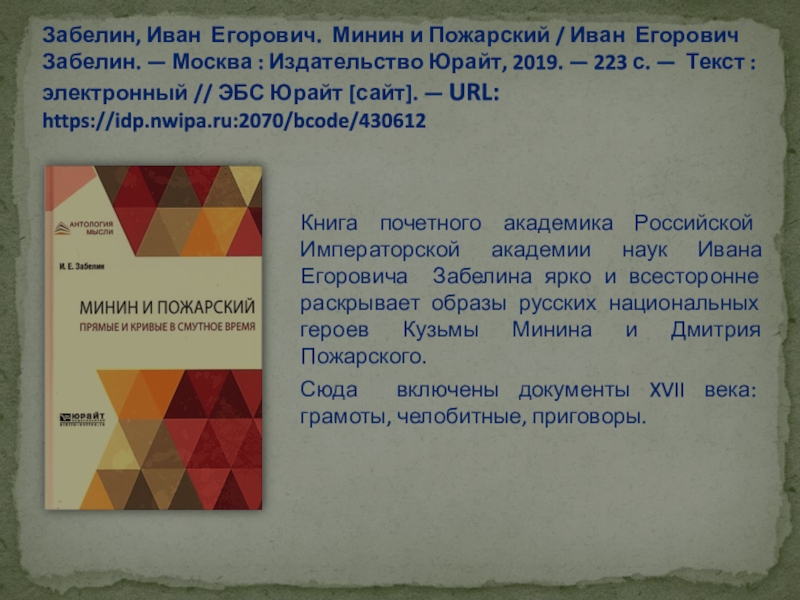 Книга почетного академика Российской Императорской академии наук Ивана Егоровича Забелина ярко и всесторонне раскрывает образы русских национальных героев Кузьмы Минина и Дмитрия Пожарского.