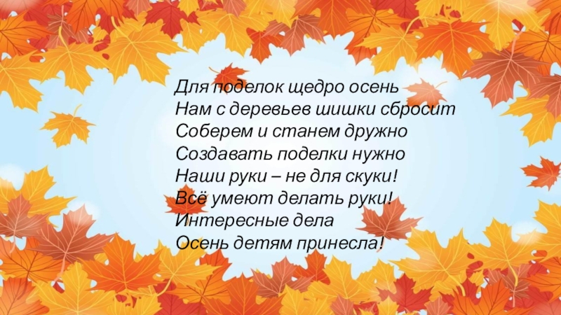 Для поделок щедро осень Нам с деревьев шишки сбросит Соберем и станем дружно Создавать поделки нужно Наши руки – не для скуки! Всё умеют делать руки! Интересные дела Осень детям принесла!