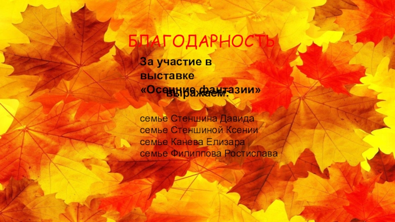 БЛАГОДАРНОСТЬЗа участие в выставке«Осенние фантазии»выражаем:семье Стеншина Давидасемье Стеншиной Ксениисемье Канева Елизарасемье Филиппова Ростислава