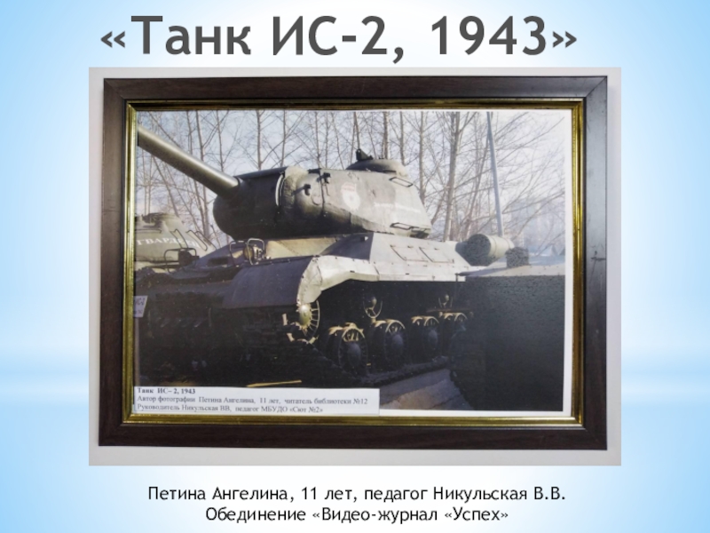 «Танк ИС-2, 1943»Петина Ангелина, 11 лет, педагог Никульская В.В. Обединение «Видео-журнал «Успех»
