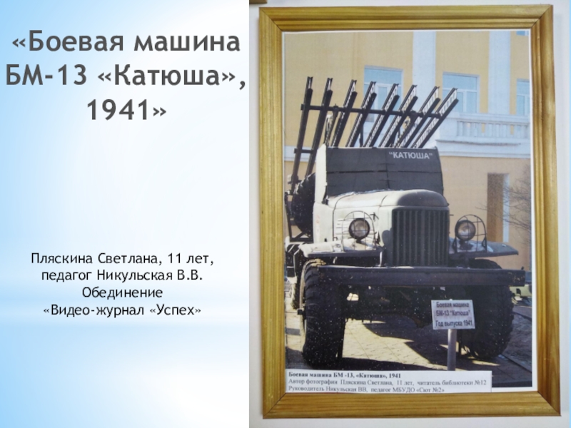 «Боевая машинаБМ-13 «Катюша»,1941»Пляскина Светлана, 11 лет, педагог Никульская В.В. Обединение «Видео-журнал «Успех»