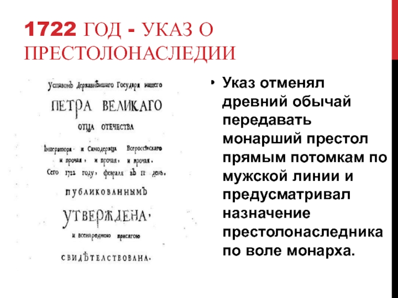 1722 год - Указ о престолонаследииУказ отменял древний обычай передавать монарший престол прямым потомкам по мужской линии и
