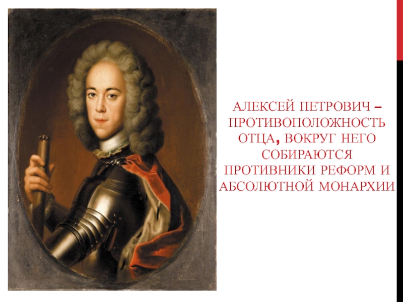 Слайд 4Алексей Петрович – противоположность отца, вокруг него собираются противники реформ