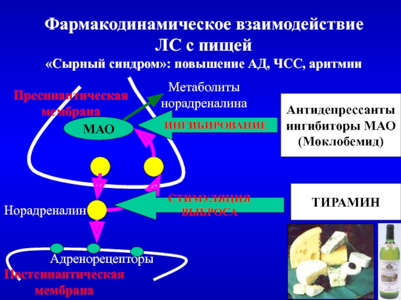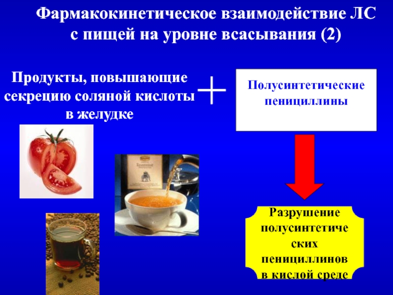 Слайд 57Фармакодинамическое взаимодействие ЛС с пищей