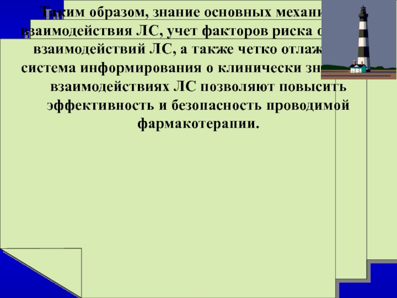 Слайд 65Таким образом, знание основных механизмов взаимодействия ЛС, учет факторов риска