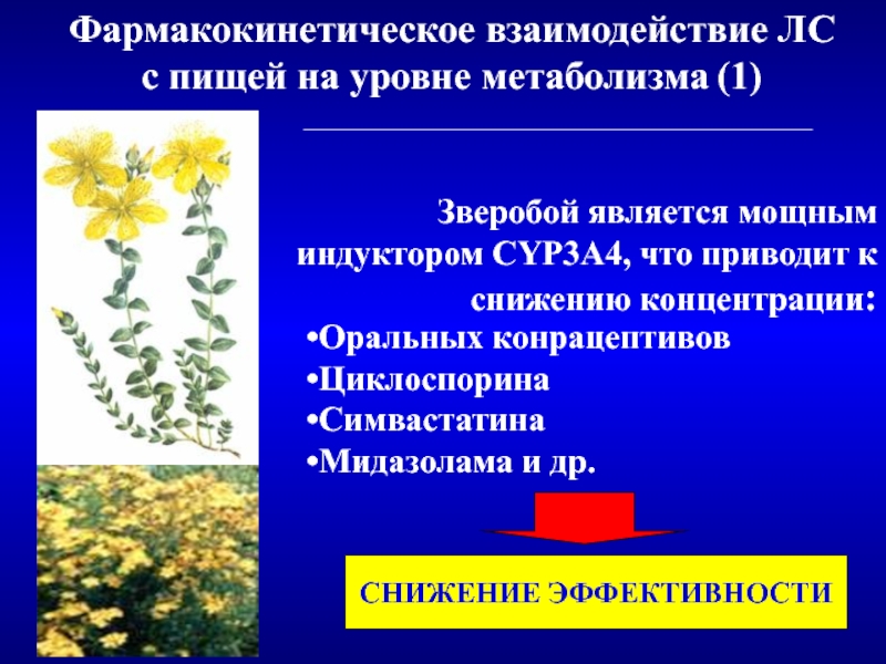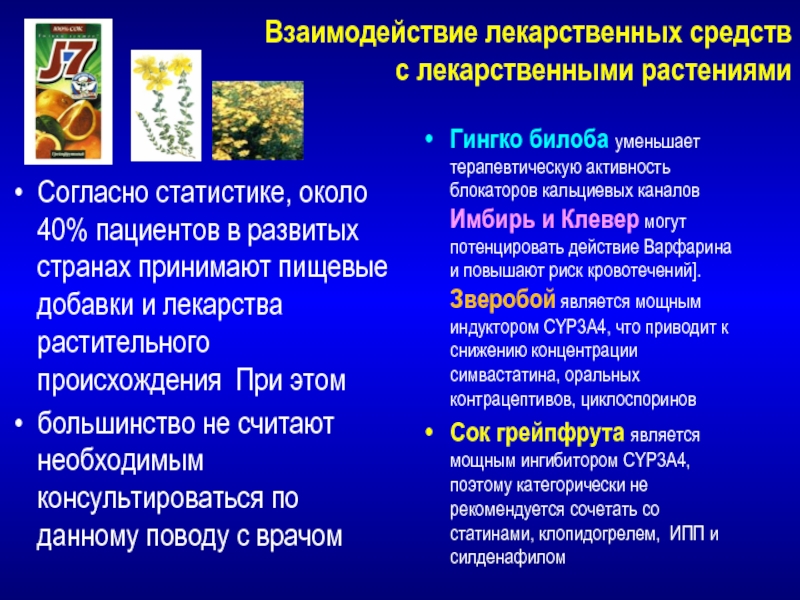 Гингко билоба уменьшает терапевтическую активность блокаторов кальциевых каналов Имбирь и Клевер могут потенцировать действие Варфарина и повышают риск кровотечений]. Зверобой является мощным индуктором CYP3A4, что приводит к снижению концентрации симвастатина, оральных контрацептивов, циклоспоринов