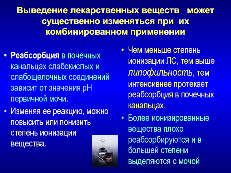 Чем меньше степень ионизации ЛС, тем выше липофильность, тем интенсивнее протекает реабсорбция в почечных канальцах.