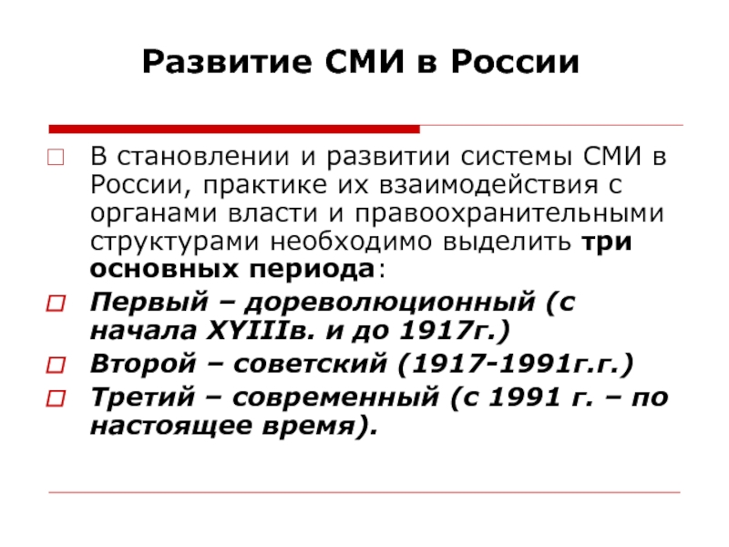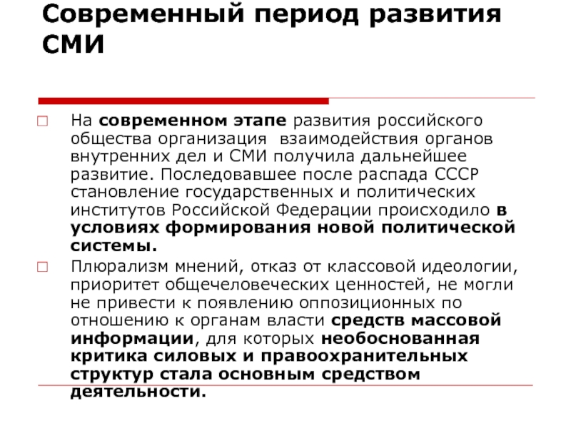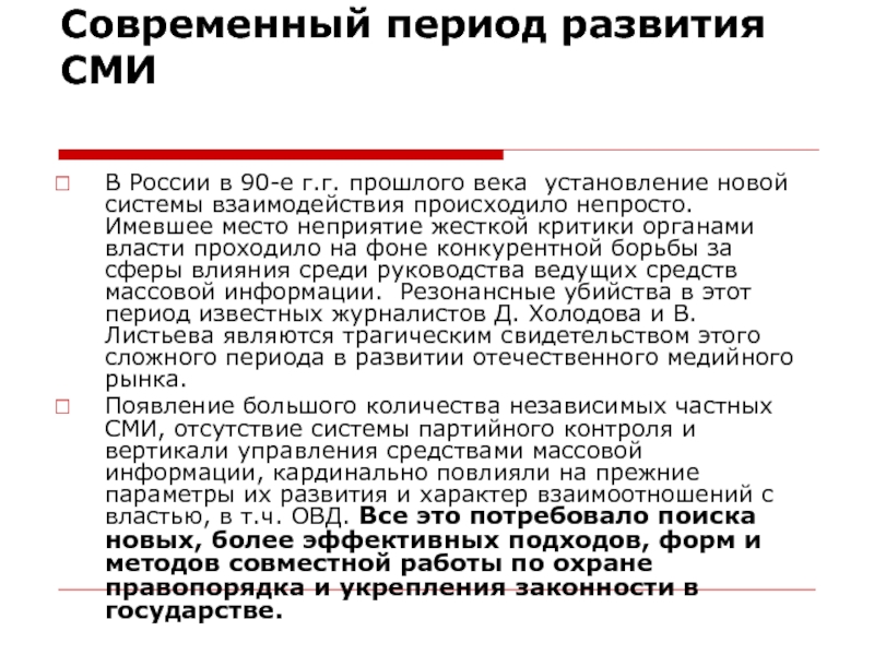 Появление большого количества независимых частных СМИ, отсутствие системы партийного контроля и вертикали управления средствами массовой информации, кардинально повлияли на прежние параметры их развития и характер взаимоотношений с властью, в т.ч. ОВД. Все это потребовало поиска новых, более эффективных подходов, форм и методов совместной работы по охране правопорядка и укрепления законности в государстве.