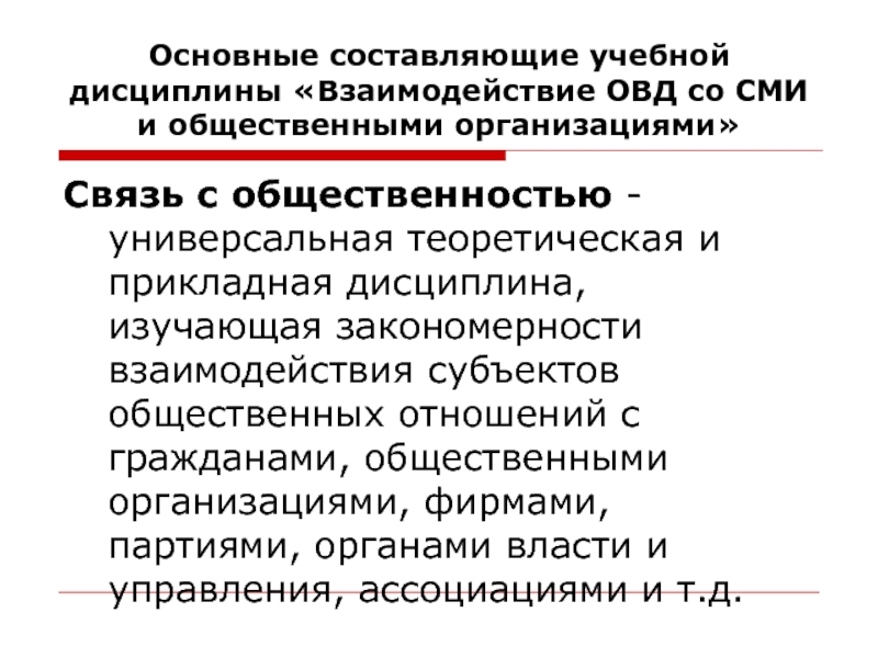 Слайд 29Основные составляющие учебной дисциплины «Взаимодействие ОВД со СМИ и общественными
