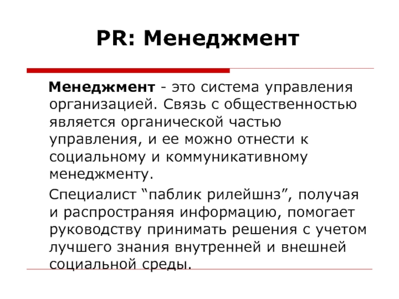 Специалист “паблик рилейшнз”, получая и распространяя информацию, помогает руководству принимать решения с учетом лучшего знания внутренней и внешней социальной среды.