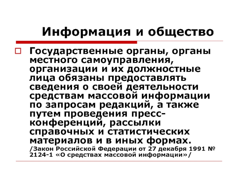 «О средствах массовой информации» граждане имеют право на оперативное получение через средства массовой информации достоверных сведений о деятельности государственных органов, органов местного самоуправления, организаций, их должностных лиц.