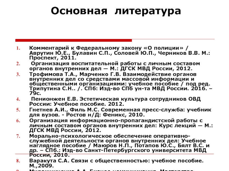 Трофимова Т.А., Марченко Г.В. Взаимодействие органов внутренних дел со средствами массовой информации и общественными организациями: учебное пособие / под ред. Трипутина С.Н.. /. СПб: Изд-во СПб ун-та МВД России. 2016. – 79c.