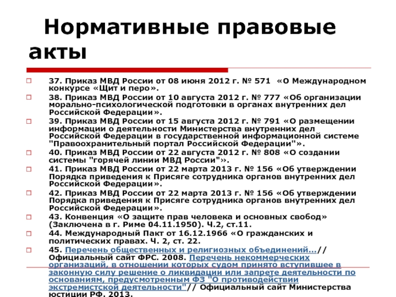 42. Приказ МВД России от 22 марта 2013 г. № 156 «Об утверждении Порядка приведения к Присяге сотрудника органов внутренних дел Российской Федерации».