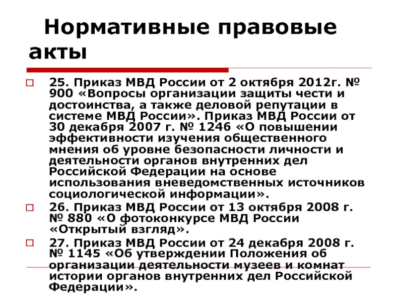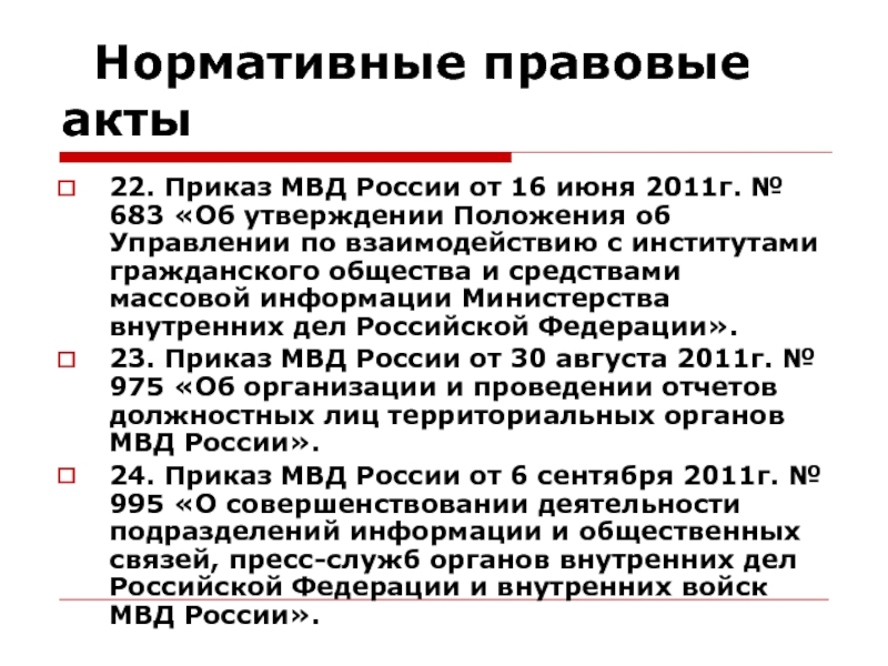 24. Приказ МВД России от 6 сентября 2011г. № 995 «О совершенствовании деятельности подразделений информации и общественных связей, пресс-служб органов внутренних дел Российской Федерации и внутренних войск МВД России».