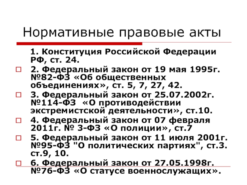 «Об общественных объединениях», ст. 5, 7, 27, 42.
