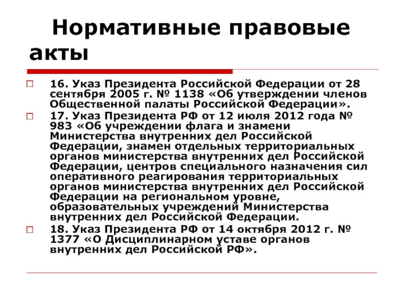 18. Указ Президента РФ от 14 октября 2012 г. № 1377 «О Дисциплинарном уставе органов внутренних дел Российской РФ».