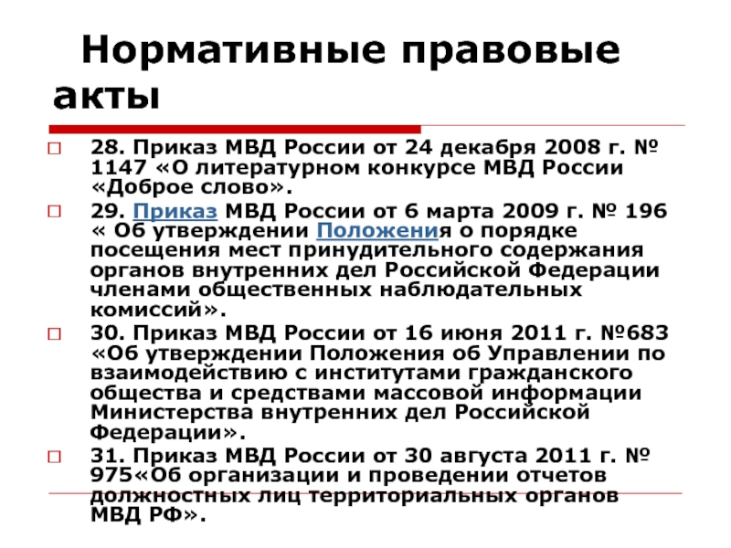 29. Приказ МВД России от 6 марта 2009 г. № 196 « Об утверждении Положения о порядке посещения мест принудительного содержания органов внутренних дел Российской Федерации членами общественных наблюдательных комиссий».