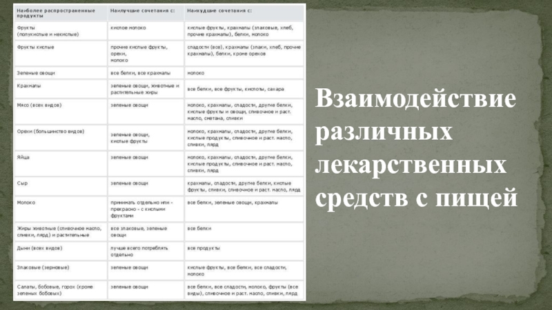Слайд 4Взаимодействие различных лекарственных средств с пищей