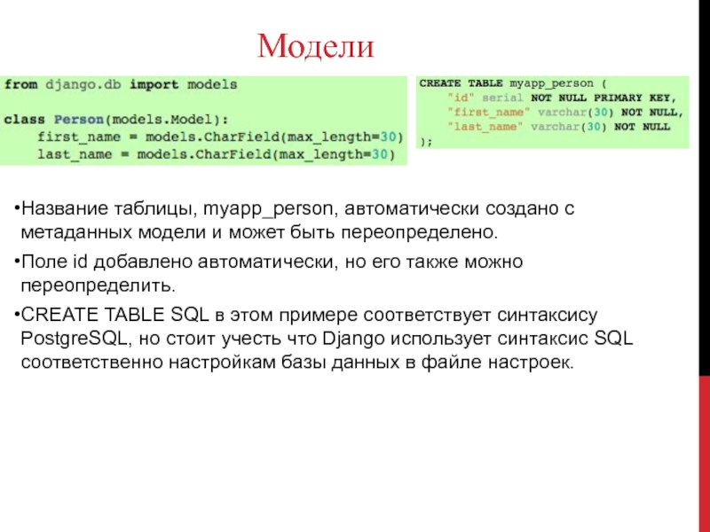 этом примере соответствует синтаксису PostgreSQL, но стоит учесть что Django использует синтаксис SQL соответственно настройкам базы данных в файле настроек.