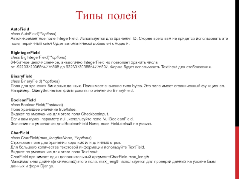 Поля для хранения бинарных данных. Принимает значение типа bytes. Это поле имеет ограниченный функционал. Например, QuerySet нельзя фильтровать по значению BinaryField.