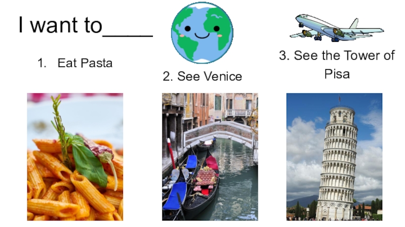 I want to____Eat Pasta2. See Venice3. See the Tower of Pisa