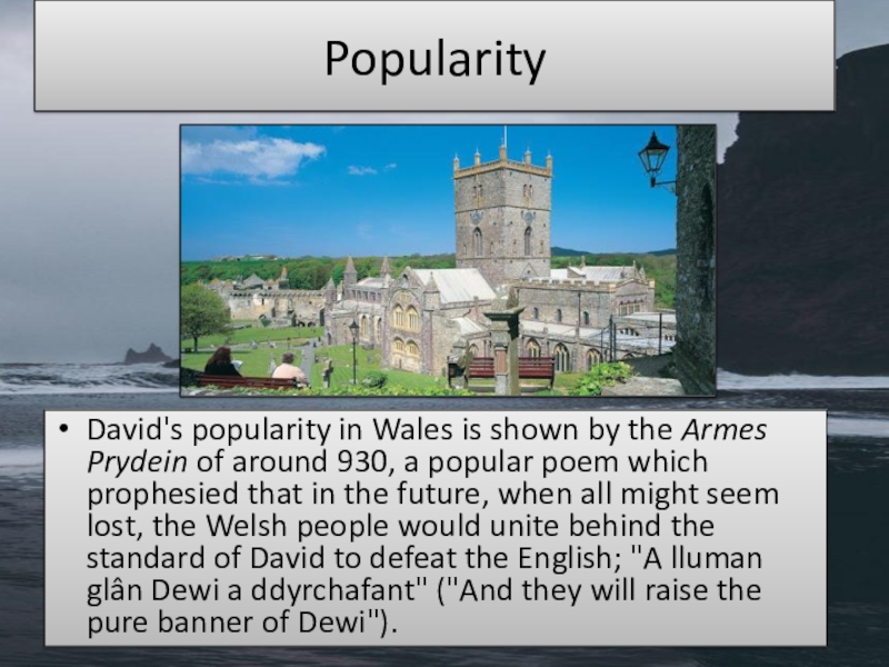 PopularityDavid's popularity in Wales is shown by the Armes Prydein of around 930, a popular poem which prophesied that