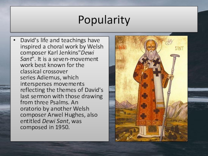 PopularityDavid's life and teachings have inspired a choral work by Welsh composer Karl Jenkins