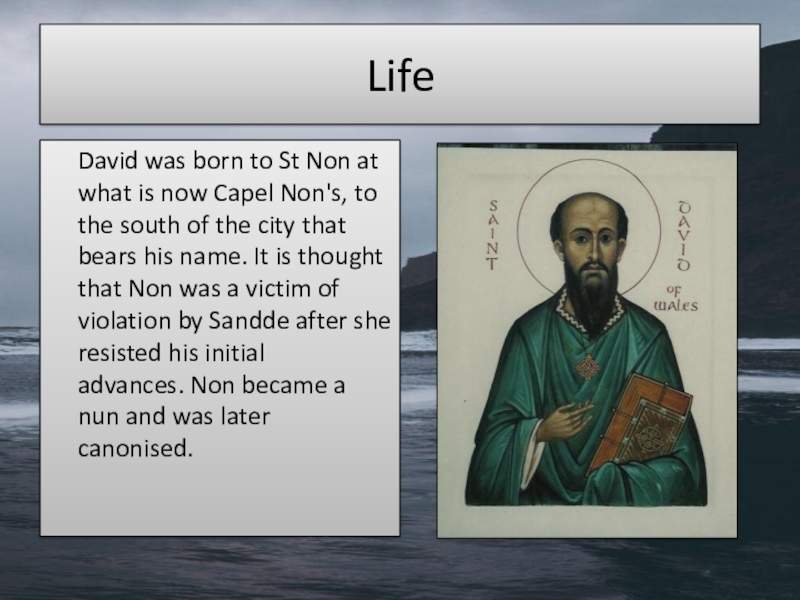 Life   David was born to St Non at what is now Capel Non's, to the